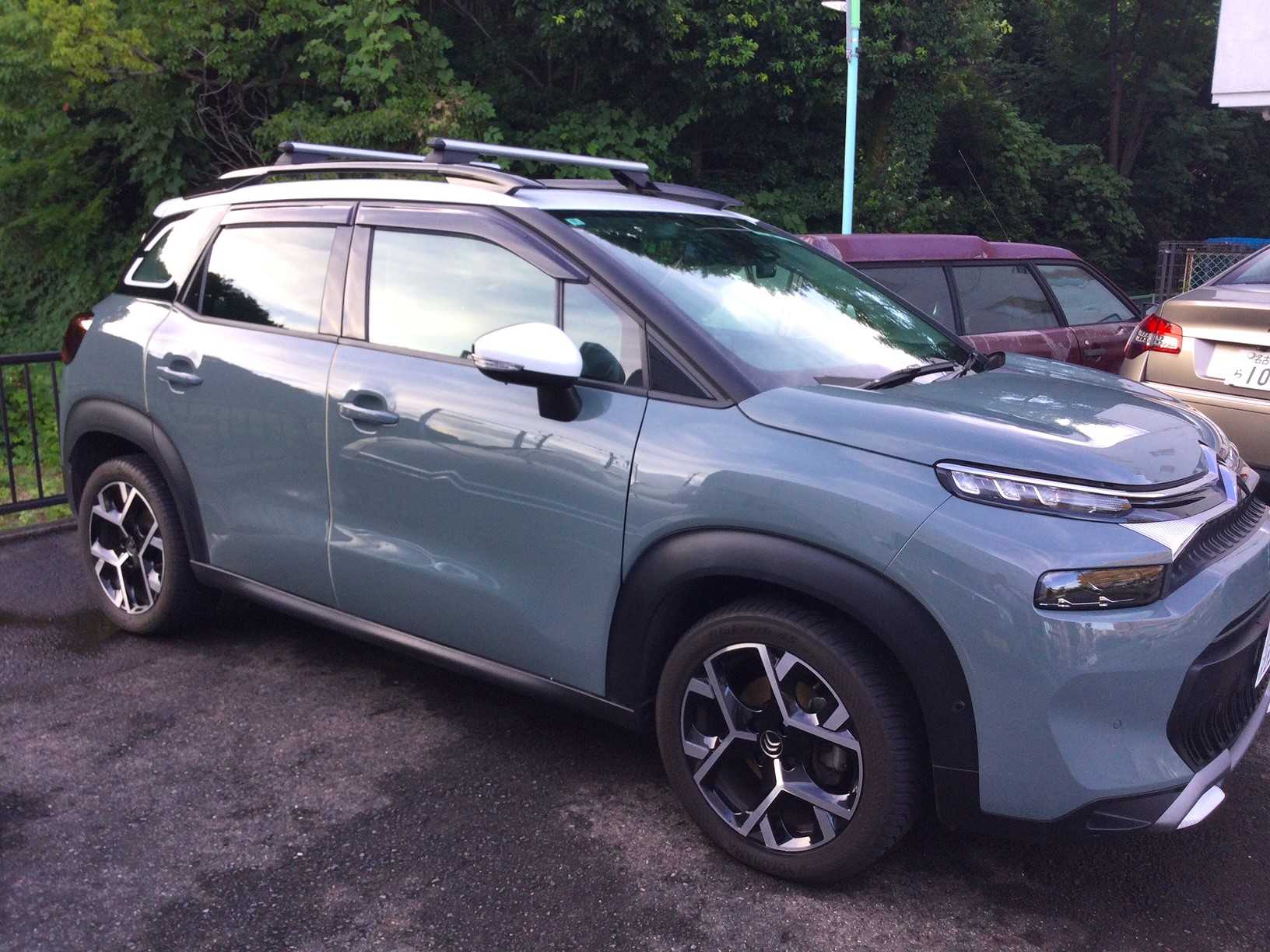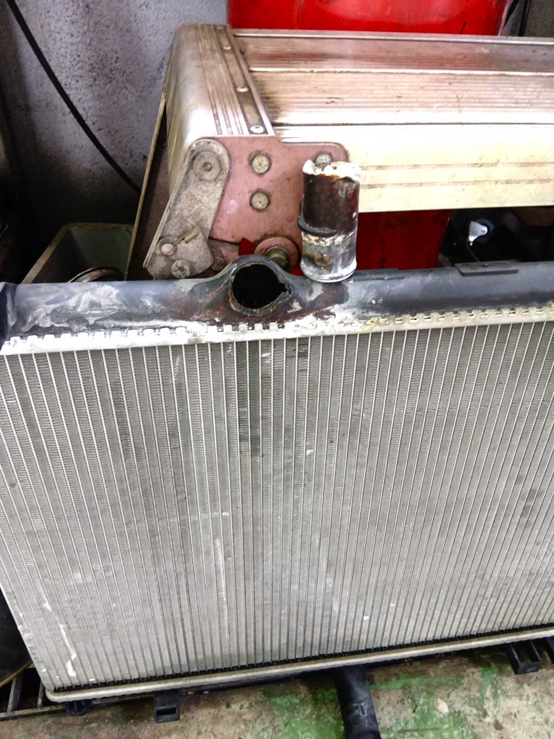 数多くの整備を終えてエンジン始動したら水がボタボタと漏れてきたC5です。よーく見ればラジエターに亀裂があります。交換するしかないです。車検を受けるのはちょっとだけ延期になりました。今日は裏山の草刈りを少しだけやりましたが暑かったです。これで道路が広くなりました。