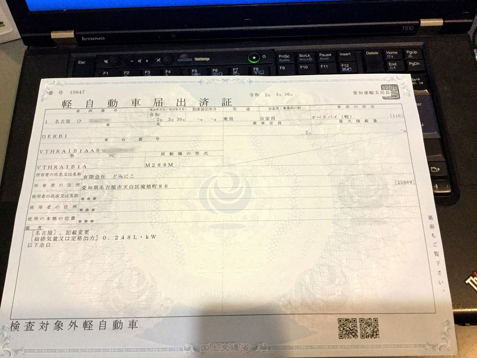 250のオートバイの名義変更をしました。