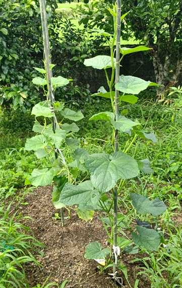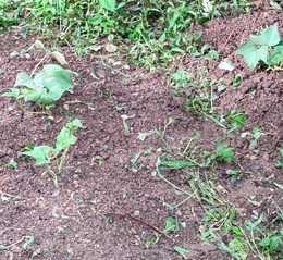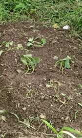 テニスから帰って、小一時間、大まかに草を引き、畝を整備して、取り敢えずサツマイモの蔓を植えた