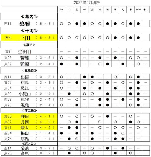 生田目は今場所も全休であるので、大きく負け越し