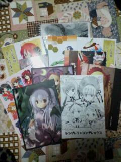 今日はかなり充実した1日でしたこんな日は久しぶりだ。うん、金の消費が激しいにもかかわらず気持ちいいぞなにかって?それはね、今日はイベントに行ってきたわけですよ。コミックライブ2007だっけ。朝の9時ごろから並んで11時20分くらいに開いてねすごい、とにかく面白かったです。行ってよかったwwありがとう(まあこれは私信さて、今日の戦利品整理今日は、ぽーとめっせ名古屋→アニメイト→メロンブックス という順番で行ってきました写真とるの大変だったので影とか気にしてません。あしからずまずはイベント品~上→下、左→右の順で5列目1番上、ローゼンメイデン画集 Snow☆DROPSさん4列目 なごや名物ういろうさん2 れつぺんさん うたわれファンブック2(名前読めません、すみません) 朱儒楼さん なごや名物ういろうさん れつぺんさん3列目 不機嫌なエメラルド ぽむぐらにっと&おおきなヤシのきのしたでさん 奏謡 ~かなでうた~ サインコサインさん2列目 Carnival! SAMMY COMPANYさん 覚醒アリス症候群 さぷり。さん 薔薇乙女の晩餐会 sapuriさん1列目 水銀カタルシス sapuriさん シンデレラ☆コンプレックス おおきなヤシのきのしたで&ぽむぐらにっとさんふうつかれたまあこんくらいだろうね。まだ読んでないよ、さっきまで寝てたしね。実はまだ2冊あったんだけどあげちゃったww次はアニメイト品~左上から佐藤利奈 まっ白な気持ち佐藤利奈 空色のリボン佐藤利奈 Memories of SummerラジオCD佐藤利奈のあの空で逢えたらvol.1生天目仁美 明日へ・・・ラジオCD佐藤利奈のあの空で逢えたらvol.2ええこれはもうwwwwwwwwwコメントしなくてもわかりますねww今日アニメイトカード作ったにもかかわらず11000ポイントたまりましたよ(オイ最後にメロンブックスでほしかったもの購入。やっぱとらのあなのほうが品ぞろえはいいのか・・・?左上からSWORD DANCERS2 episode1 比村乳業(仮)さんcantatore 路地裏萬亭さんSWORD DANCERS2 episode2 比村乳業(仮)さん恋する☆さくらむしゅび うつらうららかさんめがっさ☆かおす! 合同誌まあここは有名どころばかり集めてみました。もちろんまだ未開封wwそして友達んちにより4次会(ぇそしていろいろもらって、家に帰ったらアマゾヌ様からこんなプレゼントが・・・上からFate/staynight原画集ネギま!17巻SOUNDROP"MOE" お嬢様ローゼンメイデン1巻AQUAPLUSカレンダー2006ガルマヒヨコ彗星ヒヨコ ゴールドバージョン下のほうはもらい物、上の方はアマゾヌ様ですお嬢様はかぶったからもらったww最後に全部並べて見ましたよ・・・・わ!みにくっ見にくいのはご勘弁です。さて、ここでいろいろ整理しますか。なんかあれですね全部で合計21000円くらい使ってますわあーこれじゃあ金足りねえwwMH2P買おうとしてんのにwwwまあ買いますけどねそれにしてもよかったですコスプレブースにも足を踏み入れました、何度かそしたらギャンがいたのでびっくりです。あと噴いたのは体操座りのアダム(エヴァンゲリオン)wwwwwwwwまじ面白かったです。また行きたいけど金がなあ・・・あとから考えよ・・・でわwww