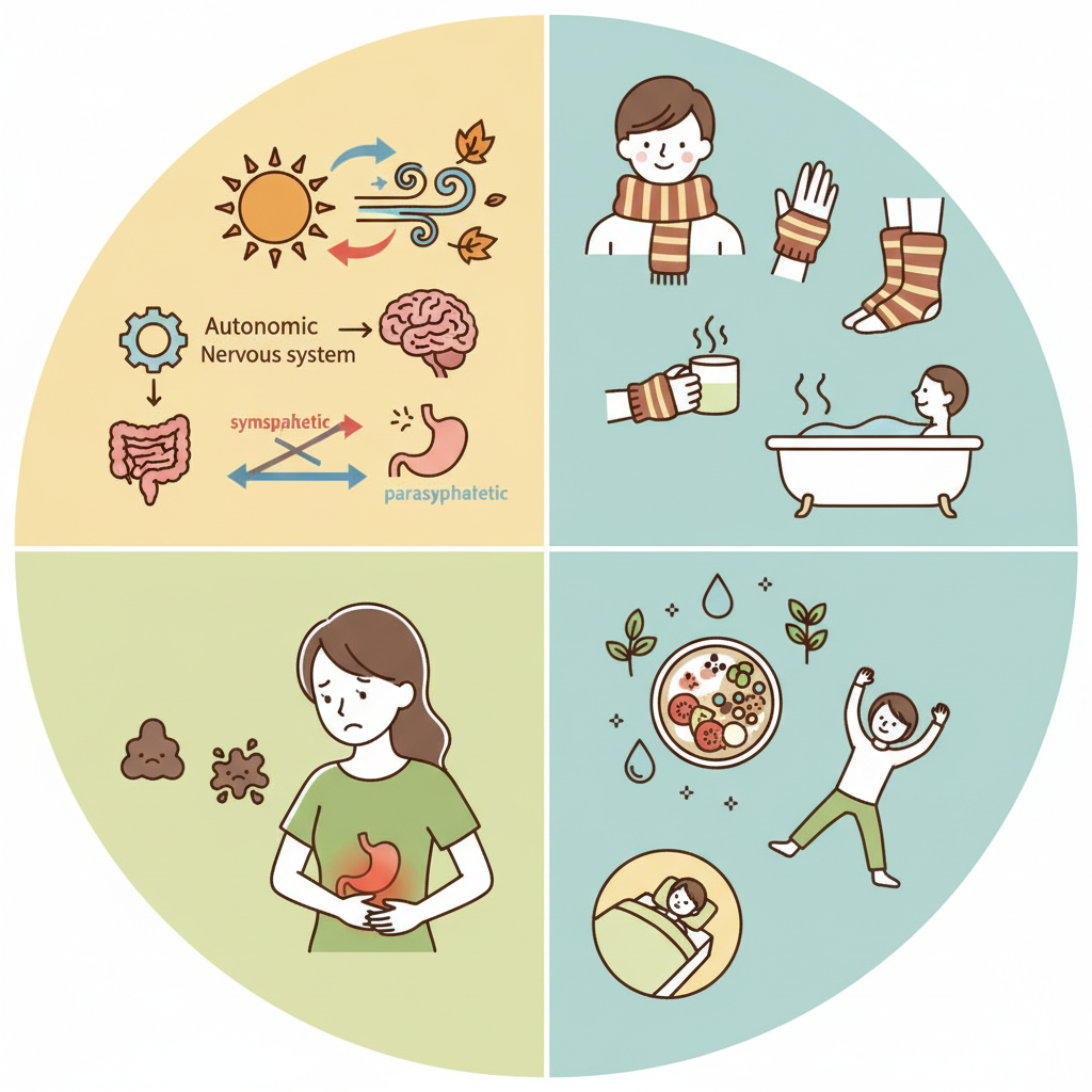 今回は、秋の寒暖差が胃腸に与える影響と、 自律神経を整えて季節の不調を撃退 する具体的なセルフケアの方法を解説します。
