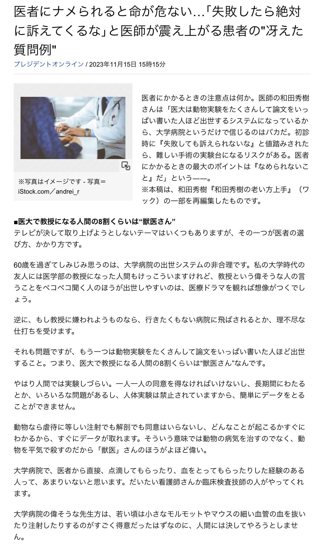 勉強して賢くなるべきというのは大賛成。ネットでググっても基礎が身に付いていなければ理解出来ないので、放送大学でしっかりと基礎的な科目を勉強した方がいい。医者に渡す5万円程の端金は逆効果とはいい事を知った。施設の改築や設備投資ぐらい出来る額でないと意味ないという事は一千万円以上だから貧乏人は碌な医療を受けられない事になる。ただ、そんなに喧嘩腰にならなくても勉強してカルテの書き方を覚えて主訴ぐらい自分で書く方が面倒な仕事が減って喜ばれる。問診のストレスと1枚目のカルテを書く手間を幾分削減するだけでもお互いに関係性が良くなる。味方に付けるにはどうすべきか?と考える方が賢い患者と言える。自作カルテを見せれば勉強の成果は自ずと伝わる。大学で何も学ばずただネットでググっただけでは浅い付け焼き刃の知識だと直ぐに見抜かれるだろう。命が惜しければ教養学部で良いので基礎をしっかりと身につけるべきだ。私の経験上、獣医師には比較的に名医が多い。人医は歯科も含め患者次第という印象。動物を救う医者=獣医と、動物を殺す医者=人医の違いもあろうが、やはり、獣医師には恐らく動物が好きで獣医師になる人が圧倒的に多く、獣医の藪医者は医学部の滑り止め組の落ちこぼれなのだろうと思う。一方で人医は最初の動機から志しが高い人が稀だろうし、ましてや人が好きだから医者になったなんて奇特な人は細川博司先生ぐらいしかいない。殆どが他人にマウント取れて儲かりそうで特権階級だからなのでは?でなければ日本の医師も米国並みにヒーロー気質の医者が1万7千人いても不思議ではないはずが、本当に患者の為に戦う医師は、不勉強な患者共からアタオカ呼ばわりや藪医者呼ばわりする。患者のレベルの低さも日本の9割の医師の倫理観の欠落の原因か。臨床倫理学を日本の医大に導入しても日本の医学部が命を殺して儲ける事に良心の呵責が無いなら焼け石に水だろう。一体彼らは何の為に医学を学んでいるのだろう。やはり地位と金儲けか。その点、昔、ネットで知り合った獣医さん達の話は対照的だ。「獣医師になるには動物の命を犠牲にして学ぶ過程を乗り越えなければならない。その子の命の十字架を一生背負い、その子の分まで命を救う覚悟が出来る人でないと獣医学部はお薦め出来ない」動物の命をそこまで重く受け止めてらっしゃるからこそ、こちらが愛犬や愛猫を本気で救いたい時に力を貸して下さる先生もいらっしゃるのだと思う。その差は命全般への重さを強く受け止める感性にあるのかも知れない。