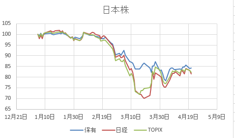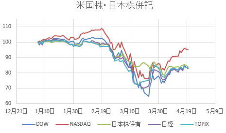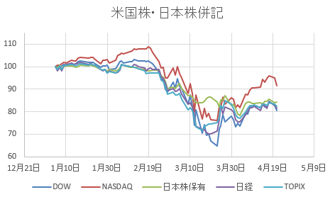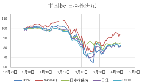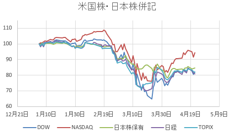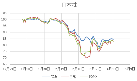 様子見。 寄付き後では、持株は前日比50%が下落。 α.評価額 (β.日経平均 ) 差(αーβ) (γ.TOPIX) 差(αーγ)①寄付売買後 +0.43%(-1.09%)(+1.52%)(-0.93%) (+1.36%) ( 19,455.32) (前日比-213.80) ( 1,419.16) (前日比-13.25) (JASDAQ平均:-0.33%、マザーズ指数:-0.78%) ②前引け後 . %( . %)( . %)( . %) ( . %)③大引け後 . %( . %)( . %)( . %) ( . %)差(③-①) . %( . %) ( . %)評価額変動割合(銘柄個別/保有銘柄絶対値総和) lowest highest 差 1st(δ) 2nd 3rd 1st(ε) 2nd 3rd (ε-δ)①寄付売買後 -11.62% - 3.05% - 0.88% +74.03% + 4.00% + 2.33% 85.65%②前引け後 % % % % % % %③大引け後 % % % % % % %2020年売買評価率(下限=-1.11(予想配当改善率×ー1))寄付き:+ 1.89%原油先物(5月物)は一時史上初のマイナスがあったらしい。 日経先物(CME) ダウ先物(CME) BTC 原油先物(WTI) 金先物(CME) 09:10頃 + 50 ー 78 +0.47% + 4.06% ー0.43% (21.26)