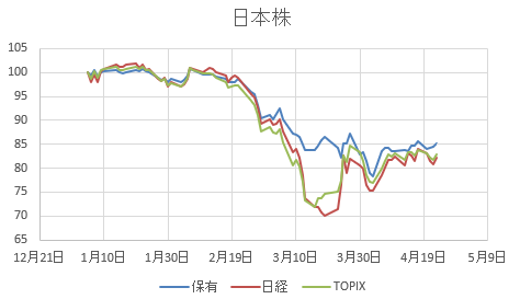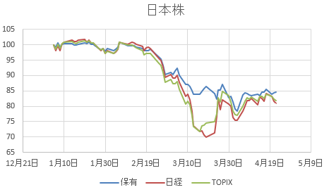 様子見。 寄付き後では、持株は前日比69%が下落。 前引け後では、 56%が下落。寄付きからは63%が上昇。 日経寄与は順に ファーストリテ(-22.69)、TEL(-15.13)、中外製薬(+12.25)、オリンパス(+10.66) α.評価額 (β.日経平均 ) 差(αーβ) (γ.TOPIX) 差(αーγ)①寄付売買後 -0.50%(-0.76%)(+0.26%)(-0.85%) (+0.35%) ( 19,281.65) (前日比-147.79) ( 1,413.92) (前日比-12.06) (JASDAQ平均:+0.01%、マザーズ指数:-0.26%) ②前引け後 +0.38%(-0.81%)(+1.19%)(-0.62%) (+1.00%) ( 19,272.42) (前日比-157.02) ( 1,417.21) (前日比-8.77) (JASDAQ平均:-0.00%、マザーズ指数:+0.78%) ③大引け後 . %( . %)( . %)( . %) ( . %)差(③-①) . %( . %) ( . %)評価額変動割合(銘柄個別/保有銘柄絶対値総和) lowest highest 差 1st(δ) 2nd 3rd 1st(ε) 2nd 3rd (ε-δ)①寄付売買後 -70.04% -14.01% - 6.53% + 0.28% + 0.21% 0.00% 70.32%②前引け後 - 5.52% - 4.92% - 1.56% +81.52% + 0.60% +0.36% 87.04%③大引け後 % % % % % % %2020年売買評価率(下限=-1.10(予想配当改善率×ー1))(4/23から最終アクション(買or売)のみで評価)寄付き:+ 3.58%前引け:+ 4.17% 日経先物(CME) ダウ先物(CME) BTC 原油先物(WTI) 金先物(CME) 09:20頃 ー 14 ー 281 +0.35% + 5.52% +0.11%11:40頃 + 28 ー 265 +0.85% + 6.85% +0.05% (17.63)