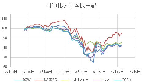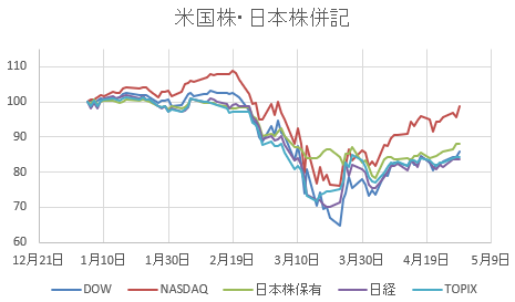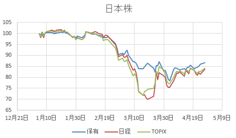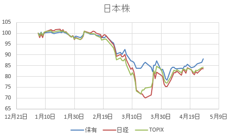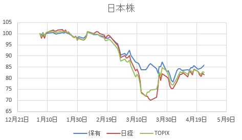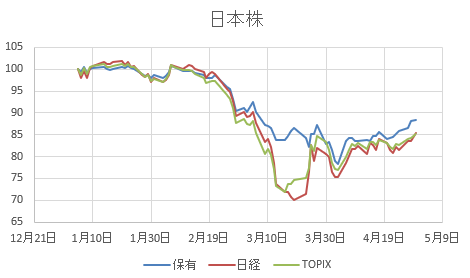 様子見。 寄付き後では、持株は前日比81%が上昇。 前引け後では、 75%が上昇。寄付きからは56%が下落。 大引け後では、 63%が上昇。前引けからは56%が下落。 日経寄与は順に前引け:ファーストリテ(+97.62)、ファナック(+40.89)、リクルート(+26.26)、TEL(+25.40)大引け:ファーストリテ(+90.06)、ファナック(+34.22)、TEL(+30.80)、リクルート(+24.86) α.評価額 (β.日経平均 ) 差(αーβ) (γ.TOPIX) 差(αーγ)①寄付売買後 +0.67%(+2.69%)(-2.02%)(+1.95%) (-1.28%) ( 20,303.56)(前日比+532.37) ( 1,477.34) (前日比+28.19) (JASDAQ平均:+0.93%、マザーズ指数:+1.61%) ②前引け後 +0.64%(+2.58%)(-1.94%)(+1.49%) (-0.85%) ( 20,281.57)(前日比+510.38) ( 1,470.73) (前日比+21.58) (JASDAQ平均:+0.90%、マザーズ指数:+2.29%) ③大引け後 +0.25%(+2.14%)(-1.89%)(+1.03%) (-0.78%) ( 20,193.69)(前日比+422.50) ( 1,464.03) (前日比+14.88) (JASDAQ平均:+0.95%、マザーズ指数:+2.23%) 差(③-①) -0.42%(-0.55%) (-0.92%)評価額変動割合(銘柄個別/保有銘柄絶対値総和) lowest highest 差 1st(δ) 2nd 3rd 1st(ε) 2nd 3rd (ε-δ)①寄付売買後 -14.73% - 1.79% - 0.95% + 60.55% +13.26% + 1.67% 75.28%②前引け後 -14.47% - 1.36% - 0.70% + 65.03% + 9.39% + 2.44% 79.50%③大引け後 -28.82% - 2.50% - 0.20% + 49.99% + 3.29% + 3.04% 78.81%2020年売買評価率(下限=-1.06(予想配当改善率×ー1))(4/23から最終アクション(買or売)のみで評価)寄付き:+ 3.38%前引け:+ 3.62%大引け:+ 3.61% 日経先物(CME) ダウ先物(CME) BTC 原油先物(WTI) 金先物(CME) 09:10頃 ー 26 ー 72 ー0.47% + 5.44% +0.97%11:40頃 ー 2 ー 33 +1.39% + 9.89% +0.70%15:10頃 ー 89 + 34 +7.34% +10.36% +1.22% (16.65)
