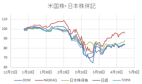 様子見(持株なし)。 持株 = なし S&P = 2,863.39 ( - 15.09 , - 0.52%), DOW = 24,101.55 ( - 32.23 , - 0.13%), NASDAQ= 8,607.73 ( - 122.43 , - 1.40%) 売却済銘柄銘柄から面白そうな銘柄を捕捉。 全て下落。時間外は殆どが上昇。 AAPL(NASDAQ、4/29決算発表) は ー 1.62%、時間外で + 0.53% MSFT(NASDAQ、4/29決算発表) は ー 2.44%、時間外で + 1.20% AMZN(NASDAQ、4/29決算発表) は ー 2.61%、時間外で + 1.25% TSLA(NASDAQ、4/29決算発表) は ー 3.71%、時間外で + 0.76% ORCL(NYSE、6/16-21決算発表) は ー 0.32%、時間外で 0.00% CRM (NYSE、6/1-7決算発表) は ー 2.01%、時間外で + 0.45% VIXは40割れ継続で更に低下。先週末と同じ3月初旬位。 ドル円 - 0.10 (- 0.10%)(106.76) 原油先物 + 1.32 (+10.70%)(13.30) ダウ先物 ー 84 (- 0.11%)(24,019;差分のみダウ終値比較) 日経先物 + 164 (+ 0.83%)(19,935;値・率は前日終値比較) (BTCは-0.64%、金先物は-0.08%、VIXは+0.84%) (BTC円は\832,047/BTC,約$7,794/BTC) (VIX=33.57)