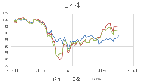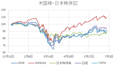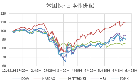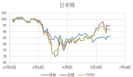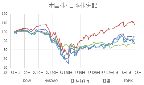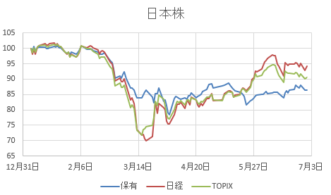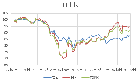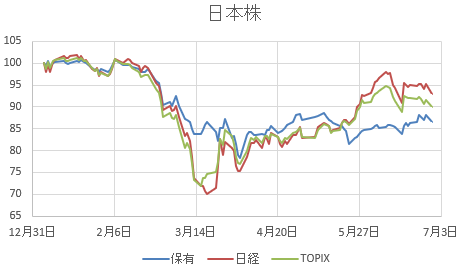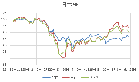 様子見。 寄付き後では、持株は前日比88%が下落。 前引け後では、 81%が下落。寄付きからは63%が下落。 大引け後では、 94%が下落。前引けからは69%が下落。 日経寄与は順に前引け:ファーストリテ(-35.30)、テルモ(-16.71)、SBG(-14.91)、ファミマ(-8.65)大引け:ファーストリテ(-52.59)、SBG(-33.07)、テルモ(-21.90)、KDDI(-13.83) α.評価額 (β.日経平均 ) 差(αーβ) (γ.TOPIX) 差(αーγ)①寄付売買後 -1.32%(-1.35%)(+0.03%)(-1.29%) (ー0.03%) ( 22,207.81) (前日比-304.27) ( 1,556.96) (前日比-20.41) (JASDAQ平均:-0.75%、マザーズ指数:-1.06%) ②前引け後 -1.39%(-1.32%)(-0.07%)(-1.20%) (-0.19%) ( 22,214.69) (前日比-297.39) ( 1,558.44) (前日比-18.93) (JASDAQ平均:-0.88%、マザーズ指数:-1.38%) ③大引け後 -1.83%(-2.30%)(+0.47%)(-1.78%) (-0.05%) ( 21,995.04) (前日比-517.04) ( 1,549.22) (前日比-28.15) (JASDAQ平均:-1.38%、マザーズ指数:-2.74%) 差(③-①) -0.51%(-0.95%) (-0.49%)評価額変動割合(銘柄個別/保有銘柄絶対値総和) lowest highest 差 1st(δ) 2nd 3rd 1st(ε) 2nd 3rd (ε-δ)①寄付売買後 -81.00% - 4.63% - 3.11% + 0.58% 0.00% - 0.22% 81.58%②前引け後 -79.36% - 6.54% - 3.46% + 1.24% + 0.40% 0.00% 80.60%③大引け後 -70.59% -11.56% - 7.05% + 0.71% - 0.06% - 0.22% 71.30%2020年売買評価率(下限=-1.44(/年、復配ならー1.08)(予想配当改善率×ー1))寄付き:ー 3.46%前引け:ー 3.92%大引け:ー 3.55% 日経先物(CME) ダウ先物(CME) BTC 原油先物(WTI) 金先物(CME) 09:10頃 + 71 - 107 ー0.23% ー 1.92% +0.31%11:40頃 ー 75 - 2 +0.04% ー 1.77% +0.33%15:20頃 + 65 - 99 ー0.34% ー 1.92% +0.33% (37.75)