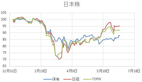 様子見。 寄付き後では、持株は前日比75%が下落。 前引け後では、 69%が下落。寄付きからは56%が下落。 大引け後では、 75%が下落。前引けからは50%が上昇。 日経寄与は順に 前引け:ファーストリテ(-35.66)、オリンパス(+25.14)、 リクルート(-16.21)、ファミマ(-13.98) 大引け:ファーストリテ(-31.70)、オリンパス(+30.84)、 リクルート(-16.64)、ファミマ(-14.55) α.評価額 (β.日経平均 ) 差(αーβ) (γ.TOPIX) 差(αーγ)①寄付売買後 -0.47%(-1.05%)(+0.58%)(-0.93%) (+0.46%) ( 22,297.66) (前日比-236.66) ( 1,565.85) (前日比-14.65) (JASDAQ平均:-0.33%、マザーズ指数:-1.18%) ②前引け後 -1.01%(-1.33%)(+0.32%)(-1.19%) (+0.18%) ( 22,234.80) (前日比-299.52) ( 1,561.63) (前日比-18.87) (JASDAQ平均:-0.62%、マザーズ指数:-0.93%) ③大引け後 -0.64%(-1.22%)(+0.58%)(-1.18%) (+0.54%) ( 22,259.79) (前日比-274.53) ( 1,561.85) (前日比-18.65) (JASDAQ平均:-0.61%、マザーズ指数:-0.43%) 差(③-①) -0.17%(-0.17%) (-0.25%)評価額変動割合(銘柄個別/保有銘柄絶対値総和) lowest highest 差 1st(δ) 2nd 3rd 1st(ε) 2nd 3rd (ε-δ)①寄付売買後 -66.50% - 9.39% -2.09% +14.09% + 0.79% + 0.47% 80.59%②前引け後 -73.79% - 7.16% -0.90% +11.03% + 2.52% + 1.08% 84.82%③大引け後 -61.62% - 8.19% -2.42% +19.07% + 4.09% + 0.89% 80.69%2020年売買評価率(下限=-1.45(/年、復配ならー1.09)(予想配当改善率×ー1))寄付き:ー 3.39%前引け:ー 3.52%大引け:ー 3.45% 日経先物(CME) ダウ先物(CME) BTC 原油先物(WTI) 金先物(CME) 09:10頃 ー 74 - 73 ー0.27% + 0.47% ー0.21%11:40頃 ー 45 - 193 ー0.43% ー 0.61% ー0.25%15:30頃 ー 50 - 209 ー1.16% ー 0.74% +0.19% (37.73)