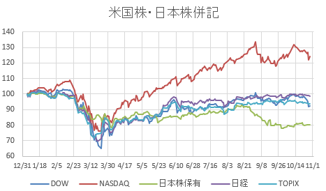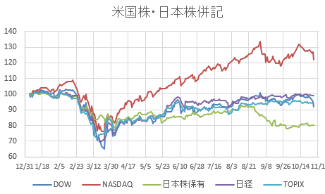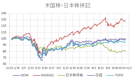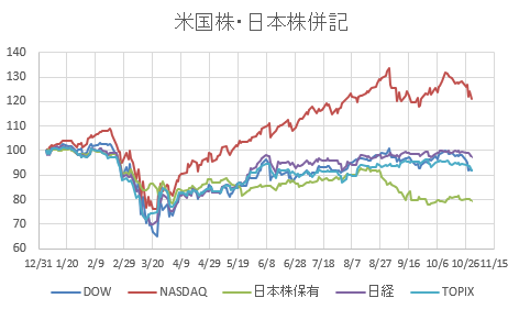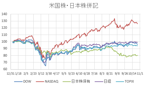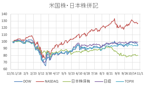 様子見(持株なし)。 持株 = なし S&P = 3,465.39 ( + 11.90 , + 0.34%), DOW = 28,335.57 ( - 28.09 , - 0.10%), NASDAQ= 11,548.28 (+ 42.28 , + 0.37%) 売却済銘柄銘柄から面白そうな銘柄を捕捉。 AAPL、TSLA以外上昇。時間外は騰落半々。 AAPL(NASDAQ、10/28決算発表) は ー 0.61%、時間外で + 0.03% MSFT(NASDAQ、10/26決算発表) は + 0.62%、時間外で + 0.29% AMZN(NASDAQ、10/28決算発表) は + 0.88%、時間外で + 0.21% TSLA(NASDAQ、10/20決算発表) は ー 1.21%、時間外で ー 0.03% ORCL(NYSE、12/9-13決算発表) は + 0.35%、時間外で ー 0.55% CRM (NYSE、11/30-12/6決算発表) は + 0.34%、時間外で ー 0.02% VIXは20台継続。WTI原油先物は40台割れ継続。 ドル円 ー 0.10 (ー 0.10%)(104.72) 原油先物 - 0.89 (- 2.19%)(39.75) ダウ先物 - 131 (- 0.22%)(28,205;差分のみダウ終値比較) 日経先物 + 23 (+ 0.10%)(23,540;値・率は前日終値比較) (BTCは-0.22%、金先物は-0.06%、VIXは-1.99%) (BTC円は\1,352,110/BTC,約$12,912/BTC) (VIX=27.55)