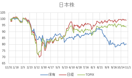 様子見。 寄付き後では、持株は前日比87%が下落。 前引け後では、 87%が下落。寄付きからは73%が下落。 大引け後では、 67%が下落。前引けからは73%が上昇。 日経寄与は順に前引け:ファーストリテ(+22.96)、TEL(-22.43)、中外製薬(+12.92)、ファナック(+12.74)大引け:TEL(-28.70)、日立建機(-22.07)、中外製薬(+13.46)、ファナック(+10.23) α.評価額 (β.日経平均 ) 差(αーβ) (γ.TOPIX) 差(αーγ)①寄付売買後 ー0.68%(+0.20%)(-0.88%)(+0.04%) (-0.72%) ( 23,521.56) (前日比+47.29) ( 1,620.51) (前日比+0.72) (JASDAQ平均:-0.24%、マザーズ指数:-2.34%) ②前引け後 -1.09%(+0.21%)(-1.30%)(+0.00%) (-1.09%) ( 23,523.95) (前日比+49.68) ( 1,619.91) (前日比+0.12) (JASDAQ平均:-0.80%、マザーズ指数:-2.81%) ③大引け後 -1.00%(+0.18%)(-1.18%)(+0.34%) (-1.34%) ( 23,516.59) (前日比+42.32) ( 1,625.32) (前日比+5.53) (JASDAQ平均:-0.09%、マザーズ指数:-0.92%) 差(③-①) -0.32%(-0.02%) (+0.30%)評価額変動割合(銘柄個別/保有銘柄絶対値総和) lowest highest 差 1st(δ) 2nd 3rd 1st(ε) 2nd 3rd (ε-δ)①寄付売買後 -58.65% -25.71% - 3.03% + 0.66% 0.00% - 3.03% 59.31%②前引け後 -63.91% -21.09% - 3.58% + 0.35% 0.00% - 3.58% 64.26%③大引け後 -64.53% -19.83% - 3.97% + 0.76% % % %2020年売買評価率(下限=-1.77(/年、復配ならー1.31)(予想配当改善率×ー1))寄付き:-14.68% 前引け:-14.67% 大引け:-15.04% 日経先物(CME) ダウ先物(CME) BTC 原油先物(WTI) 金先物(CME) 09:10頃 + 21 -113 -0.49% ー 0.07% +0.07%11:40頃 ー 9 -120 -0.12% + 0.27% +0.23%16:00頃 ー 12 -153 -0.53% ー 0.57% +0.27% (40.41)