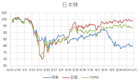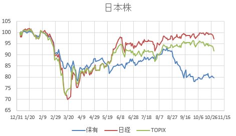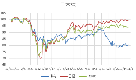 様子見。 寄付き後では、持株は前日比73%が下落。 前引け後では、 73%が下落。寄付きからは 67%が下落。 大引け後では、 93%が下落。前引けからは100%が下落。 日経寄与は順に前引け:ファナック(+38.77)、京セラ(-38.08)、アドテス(+36.06)、TEL(-26.50)大引け:京セラ(-45.65)、TEL(-39.49)、ファナック(+24.70)、SBG(-24.67) α.評価額 (β.日経平均 ) 差(αーβ) (γ.TOPIX) 差(αーγ)①寄付売買後 -0.27%(ー0.27%)( 0.00%)(ー0.62%) (+0.35%) ( 23,268.70) (前日比-63.24) ( 1,600.87) (前日比-10.06) (JASDAQ平均:-0.09%、マザーズ指数:-0.51%) ②前引け後 -0.20%(-0.79%)(+0.59%)(-1.28%) (+1.08%) ( 23,146.37) (前日比-185.57) ( 1,590.22) (前日比-20.71) (JASDAQ平均:-0.76%、マザーズ指数:-1.83%) ③大引け後 -0.73%(-1.52%)(+0.79%)(-1.96%) (+1.23%) ( 22,977.13) (前日比-354.81) ( 1,579.33) (前日比-31.60) (JASDAQ平均:-1.38%、マザーズ指数:-3.41%) 差(③-①) -0.46%(-1.25%) (-1.34%)評価額変動割合(銘柄個別/保有銘柄絶対値総和) lowest highest 差 1st(δ) 2nd 3rd 1st(ε) 2nd 3rd (ε-δ)①寄付売買後 -39.56% -22.66% -10.50% + 3.98% + 1.44% 0.00% 43.54%②前引け後 -24.30% -23.28% -10.63% +18.12% + 5.17% + 0.41% 42.42%③大引け後 -35.54% -23.33% -15.89% + 1.34% - 0.45% - 0.80% 36.88%2020年売買評価率(下限=-1.79(/年、復配ならー1.32)(予想配当改善率×ー1))寄付き:-10.87% 前引け:-10.23% 大引け:- 9.78% 日経先物(CME) ダウ先物(CME) BTC 原油先物(WTI) 金先物(CME) 09:20頃 + 16 ー256 -0.20% + 0.08% ー0.10%11:40頃 ー 11 ー292 +0.47% + 1.08% +0.42%15:30頃 ー 82 ー613 -1.63% ー 0.33% +0.17% (36.05)