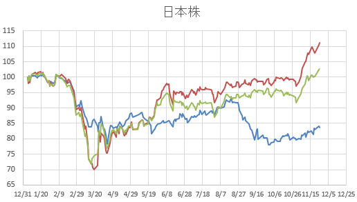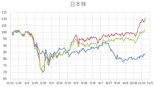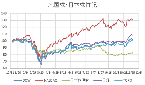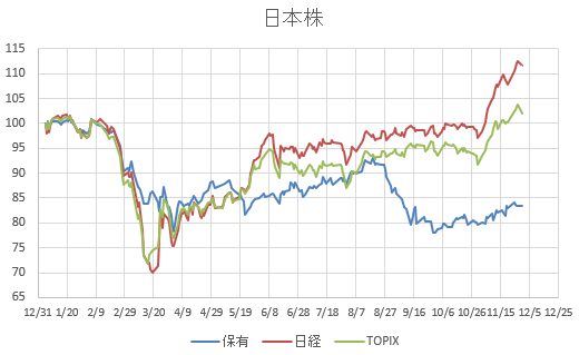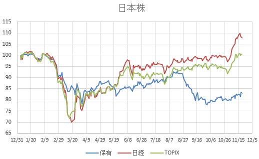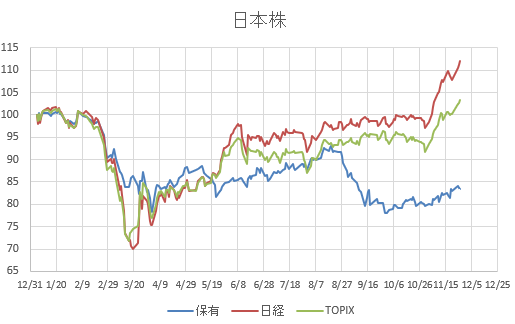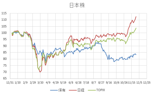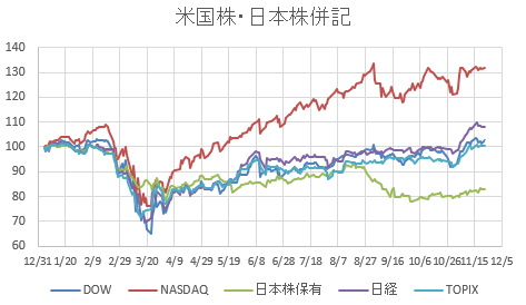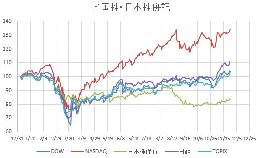 様子見。 寄付き後では、持株は前日比60%が下落。 日経は69%が下落。 前引け後では、 60%が下落。寄付きからは67%が上昇。日経は57%が下落。 大引け後では、 60%が下落。前引けからは53%が下落。日経は52%が下落。 日経寄与は順に寄付き:エムスリー(+19.13)、ファナック(-13.52)、ファーストリテ(-13.34)、SBG(+9.30)前引け:SBG(+47.82)、エムスリー(+28.82)、TEL(+24.88)、中外製薬(+16.23)大引け:SBG(+47.38)、TEL(+40.03)、エムスリー(+32.20)、ネクソン(+15.87) α.評価額 (β.日経平均 ) 差(αーβ) (γ.TOPIX) 差(αーγ)①寄付売買後 ー0.23%(ー0.05%)(ー0.18%)(ー0.14%) (ー0.09%) ( 26,281.45) (前日比-15.41) ( 1,765.02) (前日比-2.65) (JASDAQ平均:+0.13%、マザーズ指数:+0.50%) ②前引け後 ー0.21%(+0.65%)(ー0.86%)(+0.44%) (ー0.65%) ( 26,470.28)(前日比+173.42) ( 1,775.55) (前日比+7.88) (JASDAQ平均:+0.30%、マザーズ指数:+0.05%) ③大引け後 ー0.24%(+0.91%)(ー1.15%)(+0.59%) (ー0.83%) ( 26,537.31)(前日比+240.45) ( 1,778.25) (前日比+10.58) (JASDAQ平均:+0.41%、マザーズ指数:+0.39%) 差(③-①) ー0.01%(+0.96%) (+0.73%)評価額変動割合(銘柄個別/保有銘柄絶対値総和) lowest highest 差 1st(δ) 2nd 3rd 1st(ε) 2nd 3rd (ε-δ)①寄付売買後 -41.44% -18.52% - 7.53% +13.89% + 4.63% + 2.55% 55.33%②前引け後 -57.01% - 8.36% - 1.60% +14.34% + 4.62% + 2.55% 71.35%③大引け後 -57.86% - 6.79% - 2.27% +19.40% + 2.98% + 2.78% 77.26%2020年売買評価率(下限=-1.72(/年、復配ならー1.27)(予想配当改善率×ー1))寄付き:-11.65% 前引け:-11.87% 大引け:-11.97% 日経先物(CME) ダウ先物(CME) BTC 原油先物(WTI) 金先物(CME) 09:10頃 ー 14 ー 47 +0.58% + 0.28% +0.15%11:40頃 ー 15 + 18 ー1.71% + 0.68% +0.18%15:30頃 + 43 + 13 ー3.69% + 0.18% +0.17% (45.79)米国株式市場は、今日感謝祭のため休場。
