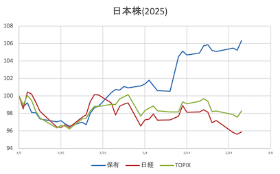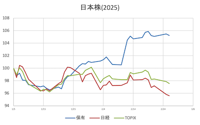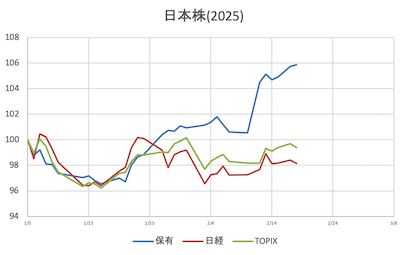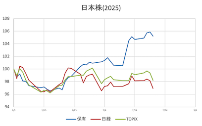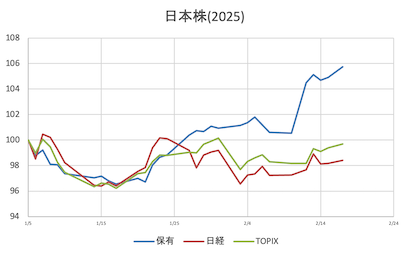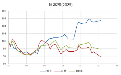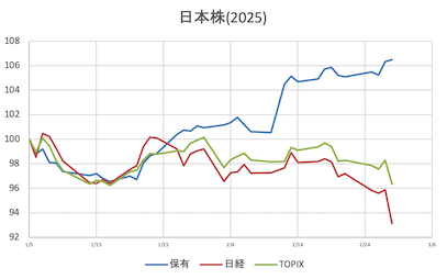 様子見日経寄与(大きい順に4銘柄)①寄付き7&i(-23.23)SBG(+17.95)ファーストリテ(-17.76)TEL(+16.28)②前引けアドテス(-30.25)7&i(-27.13)TEL(+18.25)中外製薬(-15.09)③大引け前日比①寄付き保有株 =+0.70%日経平均 =+0.09%(38,174.05)(前日比+36.81)(保有株-日経平均=+0.61%)TOPIX =+0.15%( 2,720.45)(前日比+4.21)(保有株-TOPIX =+0.55%)②前引け保有株 =+0.99%日経平均 =+0.14%(38,198.96)(前日比+56.59)(保有株-日経平均=+0.85%)TOPIX =+0.49%( 2,729.63)(前日比+13.23)(保有株-TOPIX =+0.50%)③大引け