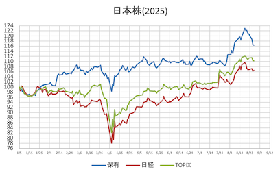 様子見日経寄与(大きい順に4銘柄)①寄付きファーストリテ(-19.45)リクルート(-11.85)ソニー(-10.47)ファナック(-10.30)②前引けファーストリテ(-49.43)SBG(+31.40)TEL(-30.89)ファナック(-15.36)③大引け前日比①寄付き保有株 =-0.97%日経平均 =-0.36%(42,673.20)(前日比-156.07)(保有株-日経平均=-0.61%)TOPIX =-0.42%( 3,077.18)(前日比-12.90)(保有株-TOPIX =-0.55%)②前引け保有株 =-1.49%日経平均 =-0.43%(42,642.97)(前日比-185.82)(保有株-日経平均=-1.06%)TOPIX =-0.51%( 3,073.95)(前日比-15.83)(保有株-TOPIX =-0.98%)③大引け