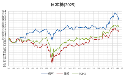 様子見日経寄与(大きい順に4銘柄)①寄付きファーストリテ(-19.45)リクルート(-11.85)ソニー(-10.47)ファナック(-10.30)②前引けファーストリテ(-49.43)SBG(+31.40)TEL(-30.89)ファナック(-15.36)③大引けSBG(+64.83)ファーストリテ(-46.19)アドテス(+31.06)KDDI(-15.40)前日比①寄付き保有株 =-0.97%日経平均 =-0.36%(42,673.20)(前日比-156.07)(保有株-日経平均=-0.61%)TOPIX =-0.42%( 3,077.18)(前日比-12.90)(保有株-TOPIX =-0.55%)②前引け保有株 =-1.49%日経平均 =-0.43%(42,642.97)(前日比-185.82)(保有株-日経平均=-1.06%)TOPIX =-0.51%( 3,073.95)(前日比-15.83)(保有株-TOPIX =-0.98%)③大引け保有株 =-1.63%日経平均 =-0.25%(42,718.47)(前日比-110.32)(保有株-日経平均=-1.38%)TOPIX =-0.47%( 3,075.18)(前日比-14.60)(保有株-TOPIX =-1.16%)