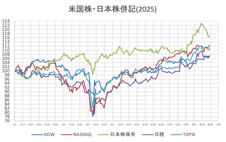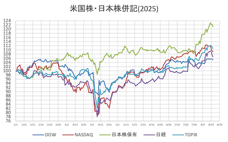 様子見日経寄与(大きい順に4銘柄)①寄付きSBG(+106.36)TEL(+23.30)ファーストリテ(-12.16)ダイキン(-5.06)②前引けSBG(+123.58)TEL(+19.25)ファーストリテ(-18.64)フジクラ(+16.04)③大引けSBG(+100.28)アドテス(+44.57)TEL(+42.04)フジクラ(+21.78)前日比①寄付き保有株 =+0.52%日経平均 =+0.31%(42,678.14)(前日比+133.60)(保有株-日経平均=+0.21%)TOPIX =+0.23%( 3,077.43)(前日比+7.12)(保有株-TOPIX =+0.29%)②前引け保有株 =+0.62%日経平均 =+0.49%(42,731.74)(前日比+211.47)(保有株-日経平均=+0.13%)TOPIX =+0.40%( 3,082.08)(前日比+12.34)(保有株-TOPIX =+0.22%)③大引け保有株 =+0.46%日経平均 =+0.72%(42,828.79)(前日比+308.52)(保有株-日経平均=-0.26%)TOPIX =+0.65%( 3,089,78)(前日比+20.04)(保有株-TOPIX =-0.19%)