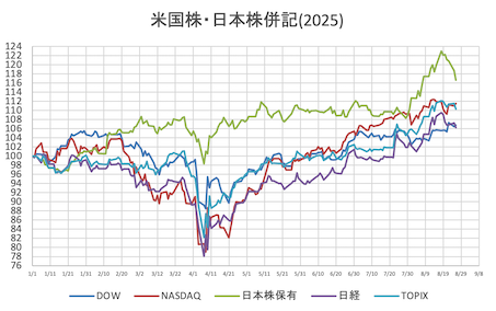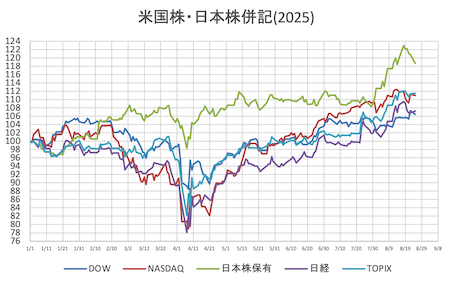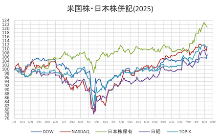 様子見日経寄与(大きい順に4銘柄)①寄付きアドテス(+125.61)TEL(-43.56)ファーストリテ(-24.31)第一三共(-21.37)②前引けSBG(-74.96)アドテス(+55.37)TEL(-42.54)第一三共(-21.98)③大引けSBG(-60.78)TEL(-51.15)アドテス(+48.62)第一三共(-29.07)前日比①寄付き保有株 =-0.24%日経平均 =-0.09%(42,850.31)(前日比-40.67)(保有株-日経平均=-0.15%)TOPIX =-0.16%( 3,093.70)(前日比-5.08)(保有株-TOPIX =-0.08%)②前引け保有株 =-0.84%日経平均 =-0.57%(42,640.56)(前日比-247.99)(保有株-日経平均=-0.27%)TOPIX =-0.53%( 3,082.55)(前日比-16.36)(保有株-TOPIX =-0.31%)③大引け保有株 =-0.93%日経平均 =-0.64%(42,610.17)(前日比-278.38)(保有株-日経平均=-0.29%)TOPIX =-0.52%( 3,082.95)(前日比-15.96)(保有株-TOPIX =-0.41%)