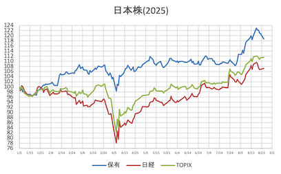様子見日経寄与(大きい順に4銘柄)①寄付きアドテス(-60.78)ファーストリテ(-29.98)信越化学(-17.22)コナミ(-14.52)②前引けSBG(+48.62)ファーストリテ(-34.04)アドテス(-27.01)ソニー(+21.27)③大引けSBG(+58.75)アドテス(-48.62)TEL(-32.92)ファーストリテ(-31.60)前日比①寄付き保有株 =-0.29%日経平均 =-0.47%(42,407.93)(前日比-202.24)(保有株-日経平均=+0.18%)TOPIX =+0.01%( 3,083.14)(前日比+0.25)(保有株-TOPIX =-0.30%)②前引け保有株 =-0.13%日経平均 =+0.01%(42,615.09)(前日比+4.92)(保有株-日経平均=-0.14%)TOPIX =+0.43%( 3,096.34)(前日比+13.39)(保有株-TOPIX =-0.56%)③大引け保有株 =-0.21%日経平均 =+0.05%(42,633.29)(前日比+23.12)(保有株-日経平均=-0.26%)TOPIX =+0.58%( 3,100.87)(前日比+17.92)(保有株-TOPIX =-0.79%)