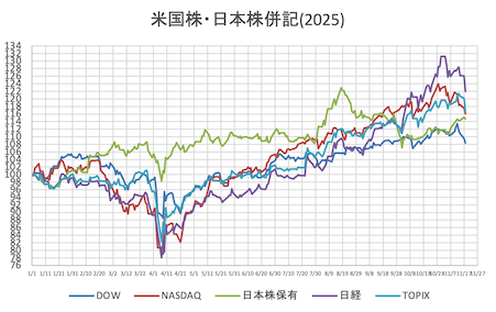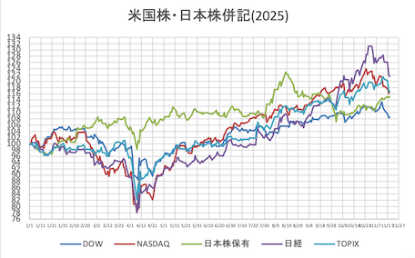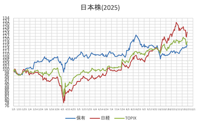 様子見日経寄与(大きい順に4銘柄)①寄付きアドテス(-224.62)ファーストリテ(+77.81)TEL(-52.14)SBG(+18.05)②前引けSBG(+81.22)ファーストリテ(+77.81)フジクラ(+18.89)コナミ(+13.20)③大引けTEL(-62.17)アドテス(-29.41)ファーストリテ(+28.08)イビデン(-16.71)前日比①寄付き保有株 =+0.59%日経平均 =-0.73%(48,328.82)(前日比-358.38)(保有株-日経平均=+1.32%)TOPIX =-0.56%( 3,231.59)(前日比-18.28)(保有株-TOPIX =+1.15%)②前引け保有株 =+0.78%日経平均 =+0.70%(49,077.49)(前日比+341.73)(保有株-日経平均=+0.08%)TOPIX =+0.75%( 3,275.36)(前日比+24.26)(保有株-TOPIX =+0.03%)③大引け保有株 =+0.44%日経平均 =-0.33%(48,537.70)(前日比-165.28)(保有株-日経平均=+0.77%)TOPIX =-0.17%( 3,245.58)(前日比-5.52)(保有株-TOPIX =+0.61%)
