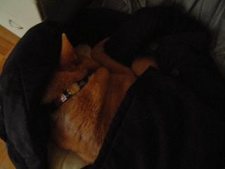 今日もまた誰もいないので翔様と留守番です。今、下のパソコン使って日記書いてますがラック小さいから使いにくい!なので、せっかく昨日サツマイモが届いたのに画像載せる事出来ません、明日載せますね♪早速食べてますが・・・腐ってる・・サツマイモ。ストーブで焼く前に切ってみて良かった、焼く1本だけ切ってみたら半分くらいまっちゃ色、1本が半分になってしまいました。今も焼いてますがこれも同じ、何だかふにゃっとするなと思ったら腐ってました。甘いんですけど、ビックリ・・・。で・・今日は、朝早くから歩いて兄(母の)にジンギスカン送るから買ってきてと言われチラシが入ったスーパーに急いで買いに行って疲れて帰ると母が化粧してました。弟から連絡があって小樽に行くそうで・・・掃除機もかけてなかったので休む間もなくかけましたよ・・洗濯途中だし。何だか今日、まだ一日終わってないのに疲れました。今日の翔様が無いので最近撮った写真を載せます。母のコートで寝ています。