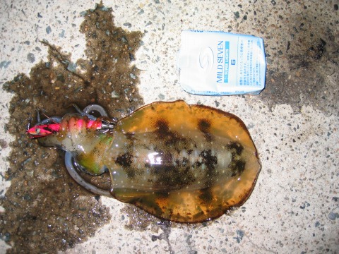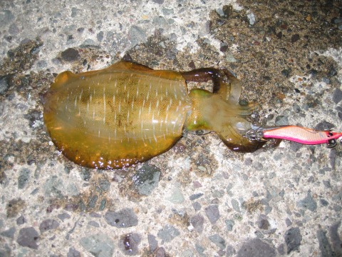 今日の午前2時~9時まで(内2時間は爆睡(^_^;)初ナイトエギングにまたまた海に行ってきました!先日購入したペツルのヘッドライトが超明るくて大活躍!まずはアピールがてらに3号エギで第1投(^O^)/スラックジャーク、HPSJ後にラインが走りました!合わせるとこの子が釣れました!ドラグゆるゆるなのでステラのドラグ音が気持ちいい(^^♪胴長16センチのナイスサイズ!ここのは成長が早いね~!場所も貸切状態で、結果朝まででリリース(ダメージ少なそうな子のみ)含めて36杯の釣果。サイズは8センチ~17センチとまずまずのサイズで楽しめました!朝になるにつれ、サイズがどんどんダウンしていきました。やっぱり夜のほうがデカイの釣れるんですかね?早速、晩飯に刺身と鍋に入れておいしくいただきました(^^♪今後がますます楽しみです!☆今期の釣果TOTAL 56杯☆最高サイズ 17センチ