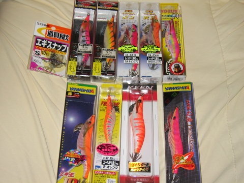 来週の月曜の晩からしゃくりに行くのでエギを仕入れました(^^♪前回2回の釣行は厳しい状況でエギロストも多く、思わしくない結果に終わったので来週の釣行はかなり気合が入ってます(^O^)/目玉エギは今話題のこれです(^^♪JINGO スクイージー ロケッティア 問題はぶっ飛ばす為につけるブースターフロートなる玉ですがこれをリーダーに通すのでやっぱりエギを変えるときはリーダー切ってから結び直すのでしょうか?着けたままだと他のエギのアクションも気になるし、ロストしてフロートがなくなったらロケッティアがただのエギになっちゃいますし・・・なんか面倒くさそう(^_^;)とこんな感じでなんのこだわりもない買い方でいろんなエギを仕入れました(^^ゞ自分の好きなエギとしてはフォールがゆっくりで沈下姿勢の角度のゆるいものが好きです。みなさんのお気に入りエギはなんですか?僕は最近ラトル入りのエギがお気に入りです(^^♪