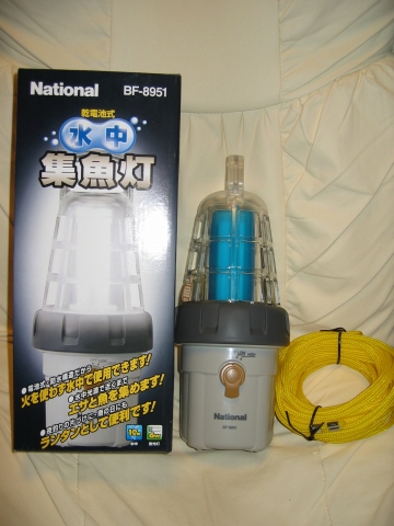 今日は台風の影響で天候に恵まれず、せっかくの休みですが久しぶりに家でおとなしくしてました来週の月曜は祝日の為、仕事が早く終わるので夜から徹夜でエギングです。またまた光一☆師匠と一緒に鬼シャクリです前回は光一☆さんと憲さんの明かりのおかげでたくさん釣らせて頂いたので、今回は自分も貢献しようとついにコイツを購入しましたダントツ安い!!ナショナル水中集魚灯!!これを点けると鯵などの小魚がライトの周りに集まり、それを狙ってイカも寄ってくるというスーパーアイテムです来週はこれで爆釣間違いなし青いフィルターが付属していて、鯵などは青い波長の光にもっともよく反応するようですラインもX-WIREに巻き変えたし準備はばっちりあとは天候次第
