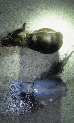 今日もしぶとくエギングしてまいりました(^O^)/ほんとは朝5:00起床のつもりが起きたら昼11:00・・・しかも目覚ましではなく師匠からの釣果どない?メールで目覚めました(^_^;)昼から行こうかと思いながらも波も高そうやし、なんか気合が入りません(^^ゞ夕方まで家でまったりしてから、舞鶴の○ングラーズにフォトコンの写真を提出しに行き、(舞鶴店では2番目のサイズでした)その足で舞鶴湾内の夕マズ目狙いでエギング開始!なんか濁ってるし、潮の流れがメチャメチャ速い!まっすぐ投げたら真横にエギが着底します・ ・ ・釣れなさそう~。でもまだ一休さんにはなりたくない(>_<)しかし場所を変えて、ストラクチャー狙いで何とか2杯GETすることが出来ました(^^♪サイズは新子サイズですがイカはイカです(爆)数にカウントします(^^ゞニューロッドに墨付けも完了したし、坊主も逃れたので納竿としました。我ながら今日は良く釣ったなという釣行でした(^^♪まだあんなとこに居ついてるイカもいるのね。浅い場所なのに・ ・ ・場所がら水温が高い場所なのでしょうか?ニューロッドのインプレはまた後日アップしますね(^O^)/ ☆本日の釣果 アオリ2杯☆本日の最大 15センチ☆今期TOTAL 420杯