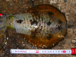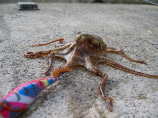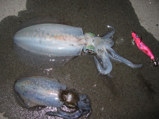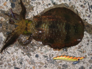 火曜の日の出とともに光一☆師匠と一緒にエギング釣行に行って参りましたが風は3~5メートル、波も4メートルと中々の荒れ具合とりあえず風裏を求めて宮津の地磯で開始するも酷い濁り具合なんとか釣りはできるもののイカが居そうな気しなかったので即撤収して○陰に移動しました。墨跡はポツポツあるもののコウイカくさい墨跡が多い・・・アオリはもういないのかなと思いながらもここしか釣りになる場所がないので早速開始1投目でラインが横に走るへんなあたり合わせると明らかに魚の引きです。沖にでたり、手前に走ったり途中でばれたかなと思うとまた沖に走り出す(^^ゞなんとか目前まで寄せてみると50センチはありそうな細長い銀色の魚がかかってますしかしそこでばれてしまい結局何かは分からずでした2投目でまたまたラインが「グンッグンッグン」と引かれるあたりひと呼吸おいて合わせると乗ってるけど全然引きませんコウイカかなと思っていると上がってきたのは初めて釣ったコイツでしたその後はしばらくあたりもなく光一さんと会話楽しみながらしゃくっていると時合い到来沖目に遠投したエギに小さいけどアオリが何杯かついてきました色も真っ黒で中々やる気満々のようです何とかサイトで2杯づつ釣ることができて、頭を丸めずに済みましたこの後に昨日のブログに書いた気分の悪い出来事が起こって納竿としました。ほんとタイミングが悪ければ坊主を食らうとこでしたあと数回のうちに確実に出家しそうです ☆本日の釣果 アオリ2杯 イイダコ1杯☆今期TOTAL 411杯目標の500杯は確実に無理です2年目のくせに大きく出過ぎでした