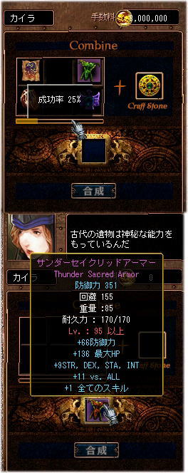 (´・ω・`)ノ チャオ♪ ここ数日。。暑さにまいって仕事から帰るとボー( ▽ )o〇OっとしてましたクロノスINしてませんでした(´・ω・`)暑すぎるヽ(`Д´)ノPCつけるとさらに暑い(´・ω・`)まぁ最近INしてもPT以外狩れるとこもマゾすぎなとこしかなくてやる事が無くなってたんですけど('A`)昨日の夜 PSしようと1鯖へ~すると!500Mで未精錬 嵐鎧を売ってるではないか(。・_・。)ノ1分ほど迷った挙句購入( ´,_ゝ`)イ ヒ今のレベルが94~。せっかくなので自分装備記念に、ちょうど材料も揃ってたのでPSするように持ってた素材で 雷に挑戦してみようとそのまま1鯖のカイラの元へ(*゜▽゜*)でキタ━━━━(°Д°)━━━━!!!!セイクは10連敗だったのに なぜかサンダーは1発で25%引き当てることが出来ました(T□T)一人1鯖で喜びをかみしめて寝ましたヾ(*´∀`*)ノキャッキャそして本日~なんとなくじゅふを購入し、(。+・`ω・´)シャキィーン☆10連敗中のセイクを目指すことに(。+・`ω・´)シャキィーン☆ ☆-(ノ゚Д゚)八(゚Д゚ )ノイエーイなんか昨日今日と25%成功v(=∩_∩=) ブイブイ!!カイラの機嫌のとり方をマスターしました(*ノωノ)さ~~て、防御紙なので作ったセイク頭(*゜▽゜*)せっかくなので素材を分けてもらってさっそく色変え~♪゚+.(ノ*`・Д・)ノ*.オオォォ☆゚・:*☆珍しくサーペントじゃなく アバオアクv(T▽T)イエーイでもねでもかぶると・・ちょっと微妙(´・ω・`)ちょっとだけね・・・。でもいつものネタ色変えにはならなかったヾ(´ー`)ノよかよか■■■■■■■■■■■■■■■■■■■■■■■■■■■■■音楽好き人間なので誰かさんの真似をして音楽載せてみることにしてみようかと思ったりYOSHIKA-LET GO昔は洋楽ばかりだったのでそっちから攻めようと思ったけど最近ハマリの方へ(*゜▽゜*)YOSHIKAは結婚・妊娠で今休止中なんだけどね(´・ω・`)この曲は涙無しでは聞けない感じにハマりますた。声がメロディがラップが いい(≧∇≦)b