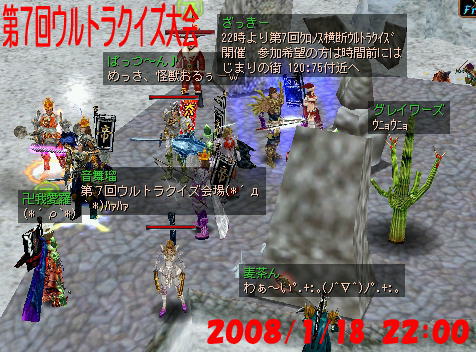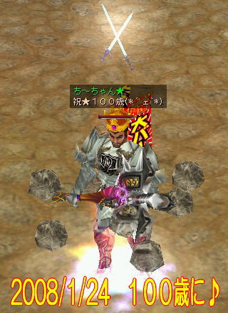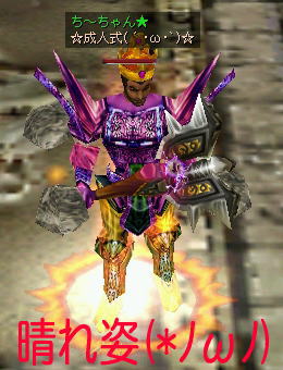 (○´∀`)ノポンジュ-ス 成人式でした(*´・ω-)b ネッ私も成人式でした(ノ∀`*)昔は(ノ∀`*)・・・・・・・・そんな目で見ないで。・(うд´)・。でも一応街で晴れ着姿の女の子見ると心躍ったのでヾ(*´∀`*)ノキャッキャちーちゃんもお祝いしときました(*ノωノ)王冠からつま先まで・・・派手さが晴れ着っぽいでしょ?全然ネタ装備ちゃうわヽ(`Д´)ノこれで普通にエンタ走り回ってるっちゅうねん・・中年・・・中年ヾ(。`Д´。)ノ彡ちゃぁうぅぅ!(そろそろ自分でもきつくなって来たのでこの辺で・・さてさて近況です(○´―`)ゞイベントが終わって、やる気がなくなる所にド━━━(゜ロ゜;)━━ン!!とつけこんで来ましたね運営(*´д`*)ハァハァ 神の祝福 増額UPイベント!見事つられました(///ω///)ちーつぅあんで!祝福初日に火炎に連れて行ってもらって97歳に☆-(ノ゚Д゚)八(゚Д゚ )ノイエーイとってもかろうじて撮れたUPの画像(:.;゚;Д;゚;.:)ハァハァそしておとといは 豚さんとじみちゃんとエンタへ(。+・`ω・´)ほんと最近ちょっとまともに狩りしてるって感じます(*ノωノ)寝おちを除いては・・・・・(o;ω;o)ウゥ・・・ 2夜連続 寝落ちしてしまいました壁|〃´△`)-3ハゥークロノス中の寝落ちって・・・電車の中のうたた寝と同じくらい気持ちいいんですよね・・・おとといも気づくと一人に(´・ω・`)・・・激しいログだけが残ってました・・なんで・・・この人たち人の眉毛の話題で盛り上がってるんでしょ・・しかも人が寝てる間に・・・(*´―――――`)ン?ゴルゴだってーーーーーー!!??(ゞノ・ω・`)ナイナイ(*´―――――`)ン?両津カンキチだってーーーーーーーーー??!!つながってるしΣ(ゞノ・ω・`)ナイナイ暇人か(σ`・д・)σYO!!!そして昨日は、再び火炎に行く事が出来ました♪ちーちゃん片手1フリしてるので、寄生じゃなく、もうシャウト・PBでPTに少しは貢献できるようになりましたヾ(´ー`)ノ死なないって楽しいヾ(*´∀`*)ノキャッキャ昨日は豪華に3人転生組み。何のノリなのかポンポンスポポン バカ変身(;´Д`)'`ァ'`ァもうPB入れてる暇(ゞノ・ω・`)ナイナイシャウトだけと思うも 足が追いつけ(ゞノ・ω・`)ナイナイでも豚には負けたく(ゞノ・ω・`)ナイナイ負けたくないから~~~~♪でも諦めたくないから~~~♪(:.;゚;Д;゚;.:)ハァハァそんな感じで昨日は火炎で45%稼いで、98歳になりました☆-(ノ゚Д゚)八(゚Д゚ )ノイエーイ課金中にどうにか100歳になれればなぁと思います(ノ∀`*)★゚'・.。☆゚'・.。★゚'・.。☆゚'・.。★゚'・.。☆゚'・.。★゚'・.。☆゚'・.。新春2発目くらいました(@ ̄□ ̄@;)!!1発目はラベちゃんでした(´・ω・`)|-`).。oO(ゴリさんそんなキャラだったっけ・・・2008年もはめられるぞっヽ(`Д´)ノ■■■■■■■■■■■■■■■■■■■■■■■■■■■■■第7回ウルトラ大陸縦断ウルトラクイズ大会のお知らせ1/18(金) 22:00(時間厳守) ラピス3鯖はじまりの町スタートです♪座標 120:75 付近にお集まりください