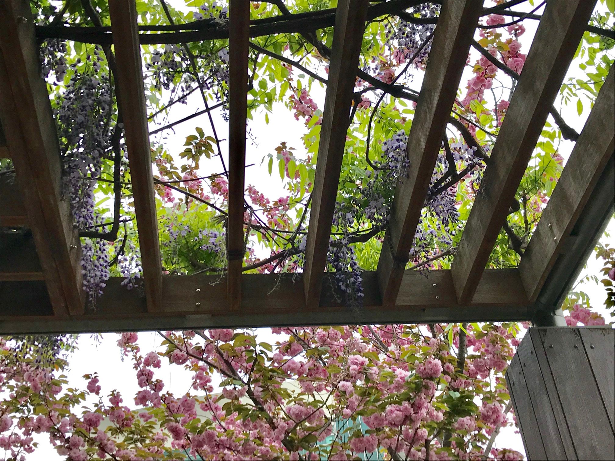 藤棚の藤と、八重桜。そして空と。近所の公園で癒されてしまうなんて、なんてお手ごろなんだろう。でも、それがちょっとした幸せなのかも分からないよね。気づけた私がラッキーってことだネ