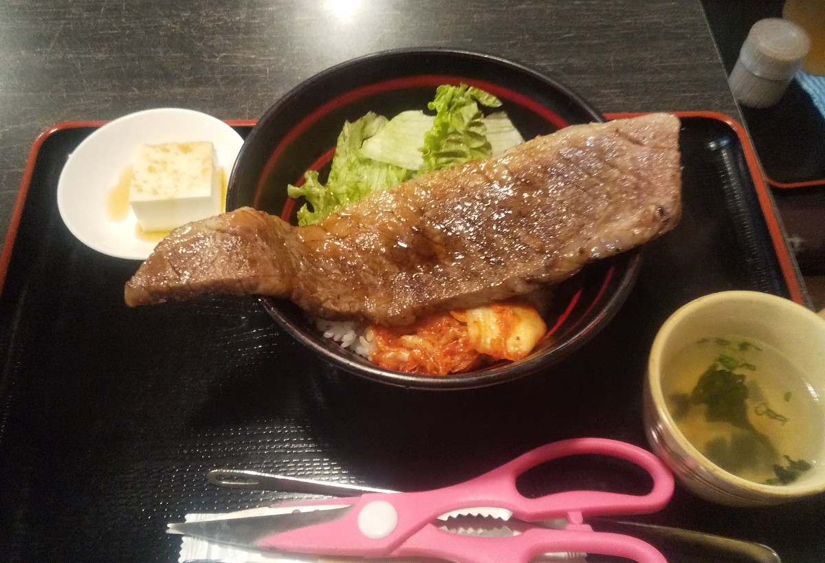 焼肉が1000円ちょいで食べられるから~と教えてもらって行ってみた。出てきたステーキ丼の見た目にビックリ。あ~、自分でカットするんだ~、みたいな。
