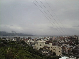 小高い丘(?)の上まで行った時、一瞬だけ雨がやんだので桜島方面を携帯で撮ってみた。