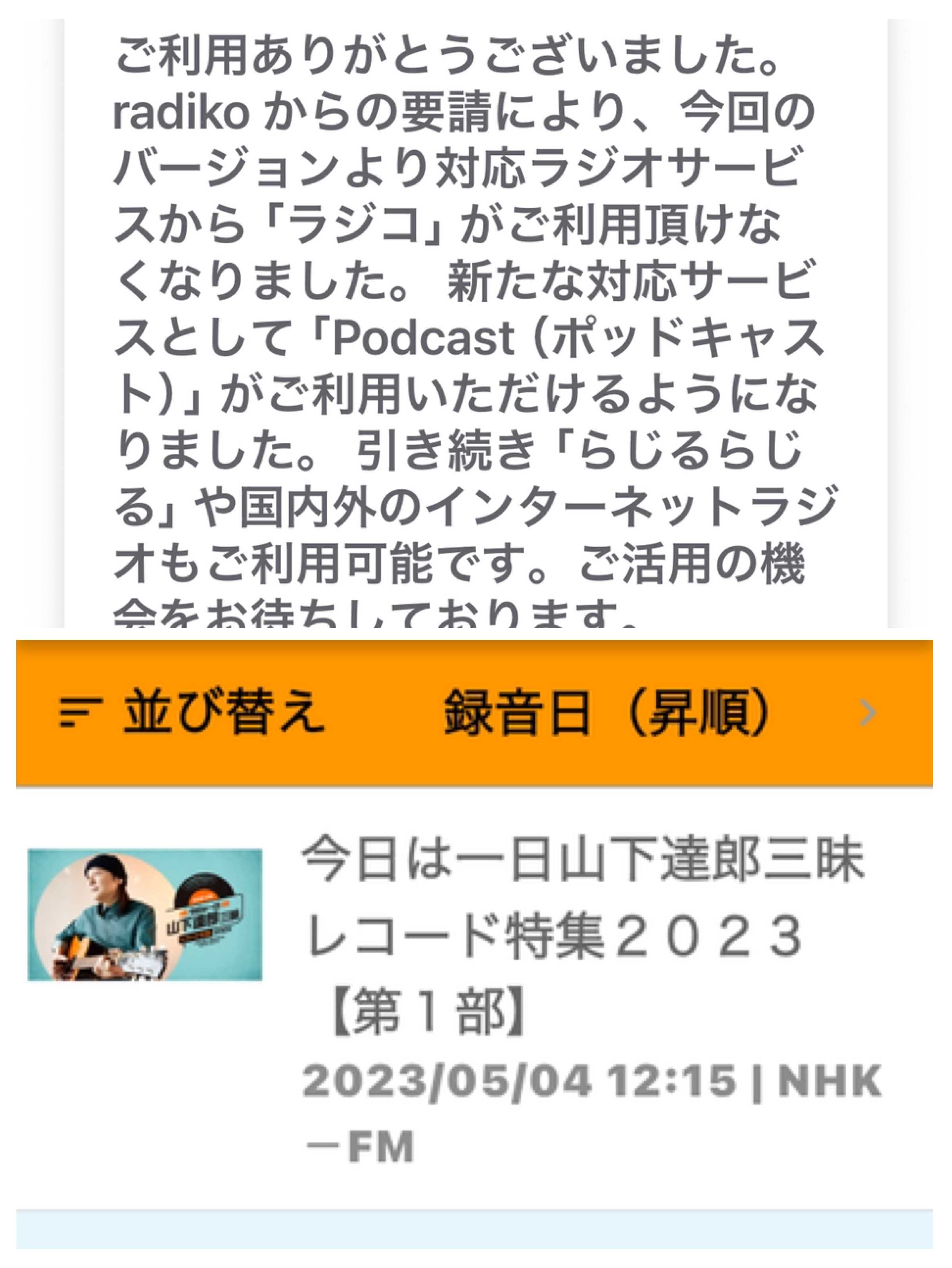 いつものように、J-WAVEのALL GOOD FRIDAYを録音しようと、らくらじ2を開くと、、ないっ!? お気に入りに登録していたラジオ曲が綺麗さっぱりなくなっている😨radikoからの要請により、利用出来なくなったとのこと毎週録音していたTokyofm 山下達郎の楽天カード サンデーソングブックほぼ、毎週はラジオ日本 クリス松村の「いい音楽あります。」ラジオ日本 宮治淳一のラジオ名盤アワーラジオNIKKEI RaNi Music♪アプリは、大事な番組がたくさん残っているのでこのまま残しておきますが、ディベロッパーの方も不本意で苦渋の決断だったことでしょうが、しかし、達郎さんの、今日から録音出来ないんですけど😂 どうしたらいいの??