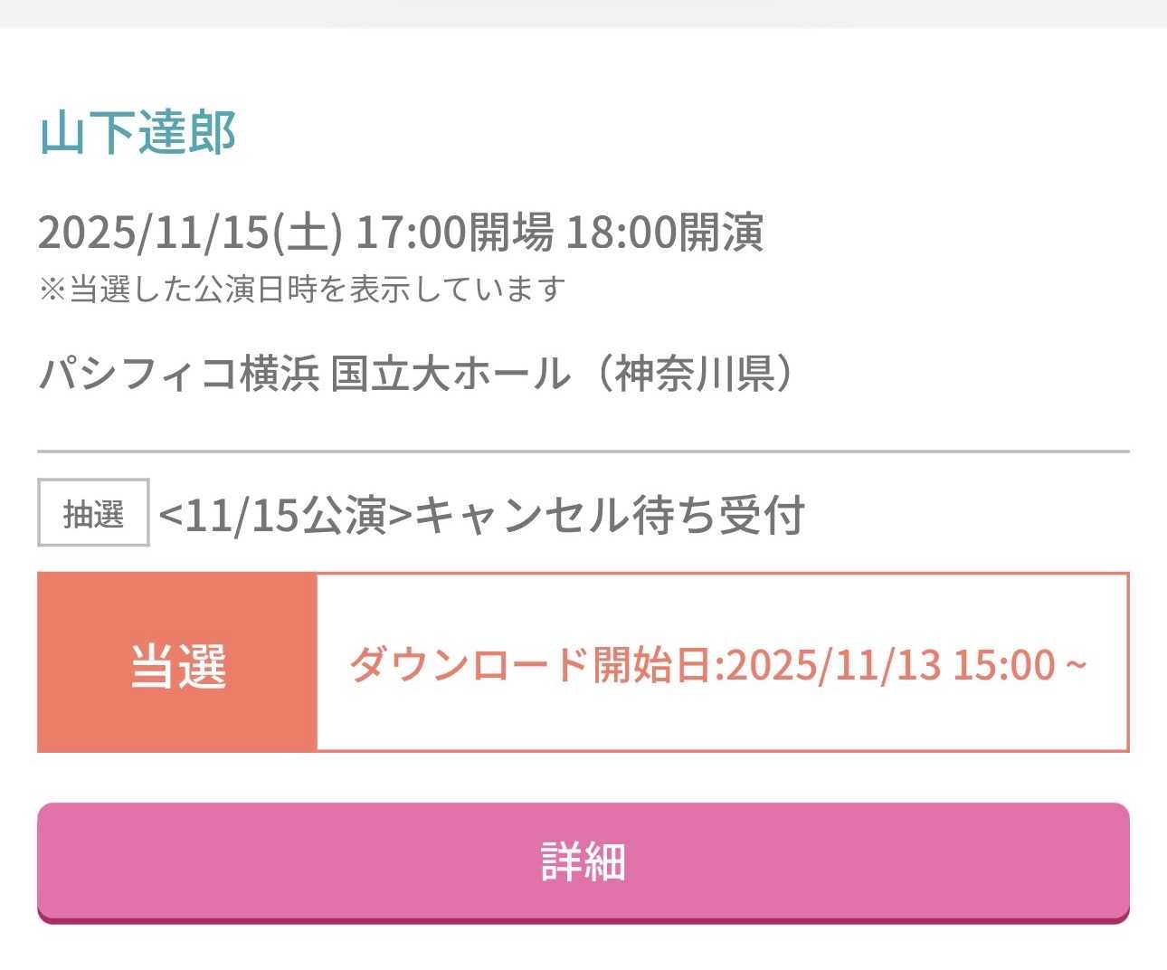 2025-11-07今年はもうダメか..と諦めかけていたら..当選しました❣️パシフィコ横浜 国立大ホール2025/11/15(土)初めてのホール初めての注釈付指定席席種・料金:注釈付指定席 料金 料金合計 : ¥11,990 内訳 <第2希望> チケット料金 :¥11,000 サービス料 :¥660 -------------------------------------------------------- システム利用料:¥330晴れたらバイクで行きたいなどこかに止められるかな?あ〜、わくわくが止まらない💖💖💖