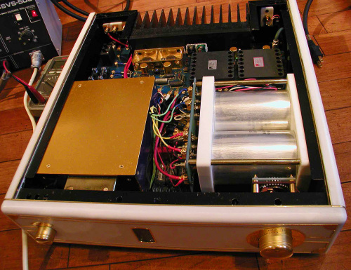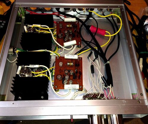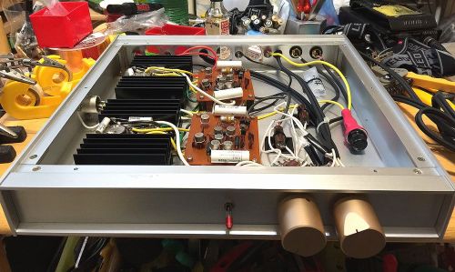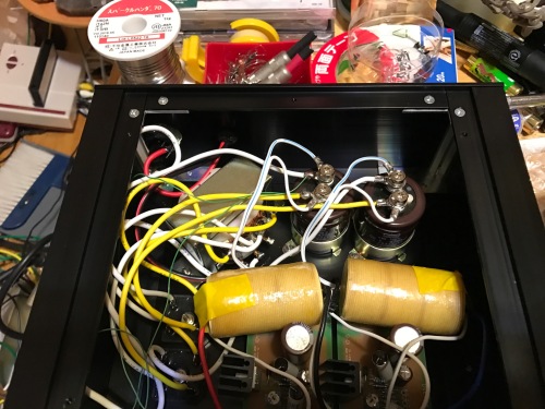 電源部作成に当たり アンプ部分も手入れして復活、スタックスジャイアント バインディングポストは、劣化割れているので撤去 バナナ端子に変更、 新たに保護回路 ヒューズbox搭載、シンプルに仕上がる試しに、バッテリーで鳴らしてみたら、圧倒的音質、石 トランジスター がメタルキャン、エミッタ抵抗なし、 半固定トリマーなし、究極だ。製作から22年以上たっているが、色褪せない。ラックスマンのm-10は、メーカー製としては最高峰のレベルなのだが瞬殺、 20から30倍くらい、チューニング dcアンプの方が良い、 なんというか、根本的に違う感じ。 車で言うとチューニングカーと F1の違いという所。電源のコンデンサーを、高性能のものにしたら、完成 またレポートします。
