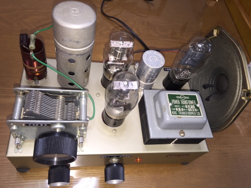 並四ラジオ、入手、 球四玉によるシンプルなラジオ、昭和半ば頃の作品、 部品も古典的な、パーツ、 しっかりした作り。アンテナ線 4メートル位で室内では、やっと受信できる感じ。野外に10メートルくらい線を引っ張れば、十分と思われる。真空管に火が入ると、なんとも不思議な感覚、音がなれば尚更、危うく受信している感覚が、哀愁を誘う。オブジェとしても、波動パワーがありそうだ。 宇田
