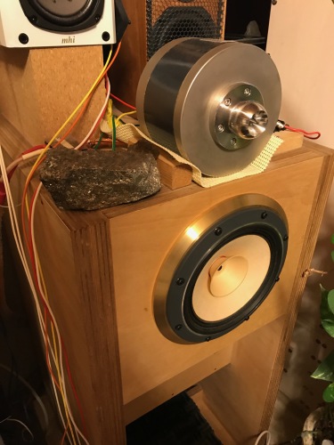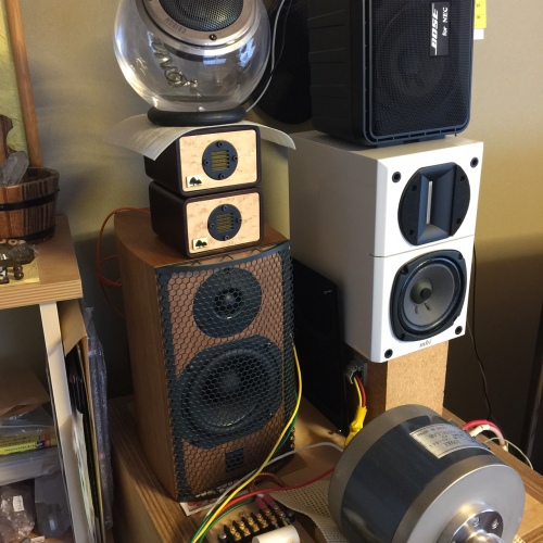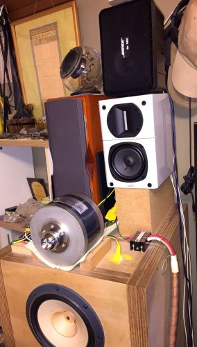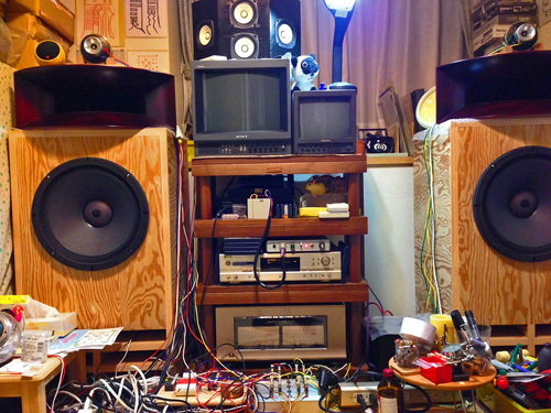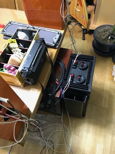 一階のサブシステム リボントゥイーター 追加の後 さらに帯域拡大 ボーズ501z シャドーベースBOX追加 により、28Hz~120KHz 広帯域スピーカーとなった。 モジョとhma-9500で試曲 広大な帯域とパワフルな音、 マーラー8番の後半のパイプオルガンが 圧倒的。ボーズ501zのシャドーベースBOXは、ハードオフで、¥5400- だったので、凄い コストパフォーマンス低音の山と がぶりよりが見事 ひとまずサブシステム完成。 宇田(注意※写真はベースBOXの配線間違え時のものです。)