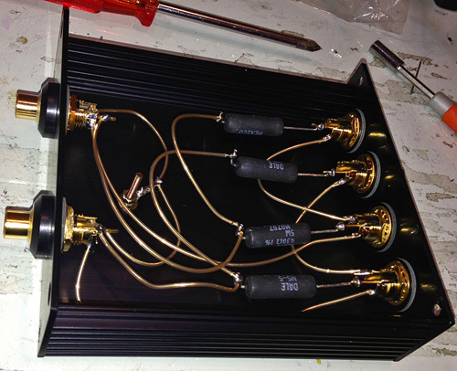 cd や プリ OUT出力を 二系統にウマく分けることが今回の課題、 パラBOXだ、 適当に2パラにすればいいのだが、きちんとした、分岐BOXをつくることによって、信頼性とハイフアイを狙う、金ワイヤーを使い、高音質の抵抗を通して、ショートなどの不測の事態にも備える設計。問題無く動作しました。 写真参考 エレスチャルの商品にもなりそうなので、小鉢という所。