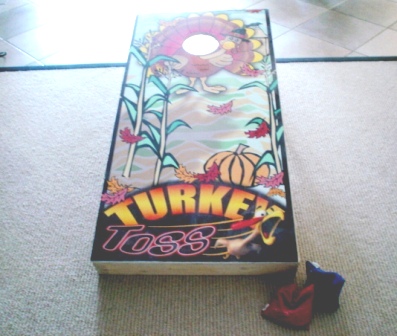 皆さんこんにちは♪ワカイバスプリングの後はスケボーをしに行ったり、夜ダウンタウンで食事したりと、特に観光地へは行きませんでした・・・ビーチや、ケネディスペースセンターに行く予定もありましたが、約2名、毎晩深酒をし、昼過ぎまで寝ていた為、予定が崩れてしまいました。まぁ、そんなことは置いといて・・・この愉快な仲間たちが来る前に、私と旦那さんで計画していたことがあります。それは・・・・ ミニミニオリンピック開催☆競技は1、ターキー トス(写真)2、バトミントン3、クロケット(日本で言うゲートボール?!)この3つです。1 のターキー トスと言うのはコーヒー豆の入った袋を投げて、この写真のボードの穴に命中させるゲームです。袋がボードの上に乗っただけでも得点になります。相手の袋を自分の投げた袋で落とせば相手の得点はなくなります。かなりの距離から投げるので単純なゲームですがなかなか難しいんですよ♪男達の熱い戦いの末・・・・出た結果はコチラ↓ じゃ~んっっ☆なんとタイです♪ってことで決着をつけるため、パットパットゴルフへ・・・(もうほんとくだらないですよね)ちなみに負けた人には罰ゲームが待っています(ふっふっふ)結果はまたあとで・・・