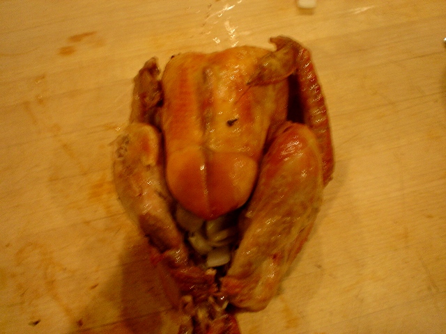 昨日は結婚後初のサンクスギビング(感謝祭)♪アメリカではこの日にターキー、マッシュポテト、パイetc・・・などのご馳走を作り家族や友人達と過ごします。毎年彼の家族と過ごしていたのですが、今年はみんなアメリカ国外に引越してしまったので二人だけの感謝祭を過ごすことに・・・いつも彼ママの簡単なお手伝い(主にパイ専門)をしていただけなのでターキーには触れたこともなかったのですが、一応アメリカ人に嫁いだので、今回(二人で)初挑戦(怖っ)。出来上がりはこれ、グロいわ。下の方の写真はスタッフィングと言ってターキーに詰めて一緒にオーブンで焼きます。テーブルと一体化しちゃってすみましぇん。この他、マッシュポテト、ターキーなどにかけるグレービーソース、クランベリーソースも作りました(パイは省き・・・怠け者です)。簡単なんですけど、後片付けが結構大変です。こっちではこれをまたクリスマスにも作るんです・・・(とほほ・・・)