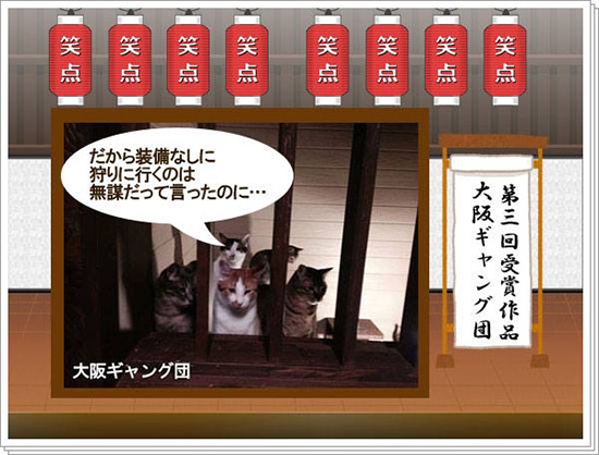 自動改札でつい隣の列にsuicaを置いてしまいます。こんばんは謎の女です。第三回猫大喜利の最優秀賞を発表いたします。今回はFacebook でご参加のShimo Yukoさんに決まりました!!!ギャング団の意外な一面が垣間見られたような大変よい作品です。Shimo Yukoさんガラクタをお送りいたしますのでお楽しみに♪今週のお題この写真でボケて締切は27日金曜夕方頃です。