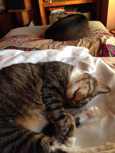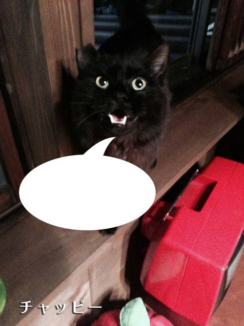 台風なので、いつもはお外に出かけているという実家猫たちを部屋に閉じ込めています。新参者のくーちゃんが、今では一番の古参のしゃーちゃんに対して、威嚇するので、くーちゃんと、すーちゃんはわたしの寝てる元おばあちゃんの部屋に、しゃーちゃんは、お母さんの部屋に隔離しました!おとなしく一晩すごしていただきたいものです。大阪のチャカどろろも心配なりねー。