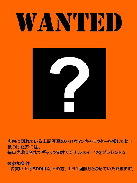 【イベントのご案内】★Halloween Event★Trick or Treat:おばけをさがせ!★イベントタイム:15~17時明日から10月31日まで『ハロウィンイベント』★Trick or Treat:おばけをさがせ!★を行います!店内掲示のWANTEDポスターに写っているハロウィンキャラクターを見つけた方、毎日先着5名様にギャッツオリジナルスイーツをプレゼント☆見つけた場所をお会計時にこっそりスタッフに教えてくださいね。※500円以上のお買い上げ(ご利用)の方、1日1回限り。キャラクターは毎日変わりますよ!みなさまのご来店、お待ちしています♪