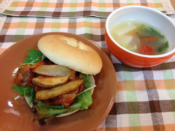 【10月ランチAsetのご紹介】秋らしい気候になってきましたね。今回のAランチは、「ぽっかぽか!」をテーマにサンドイッチとスープをご用意しました。【Aランチ】ベーグルサンドイッチ:ジャークチキン~スイートチリソース仕立て~月替わりスープ(たっぷり野菜のあったかポトフ)デザート/ドリンク付 スタンダードベーグル・・・¥850 猫の手ベーグル ・・・¥890ランチは、毎日14時まで☆みなさまのご来店、お待ちしております!