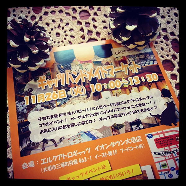 【イベントのご案内】★ギャッツハンドメイドマーケット★ 11月26日(火)10:00~13:30あさって26日(火)は、子育て支援のNPO法人クローバ!と ギャッツカフェのコラボイベント!!!店内のカフェがハンドメイドマーケットに変身します! 今回も素敵な作品がたくさん販売されますよー♪そして、毎回好評のギャッツの限定ランチBOX ¥850 今回は・・・・ ベーグルサンド:自家製鶏ハムのオレンジソース サラダ+スープ+ドリンク+デザート付 ハーブが効いた自家製鶏ハムに、オレンジの甘酸っぱい爽やかなソースが美味なサンドイッチです!11時からの販売スタート!限定20食です! 皆様のご来店、お待ちしております★