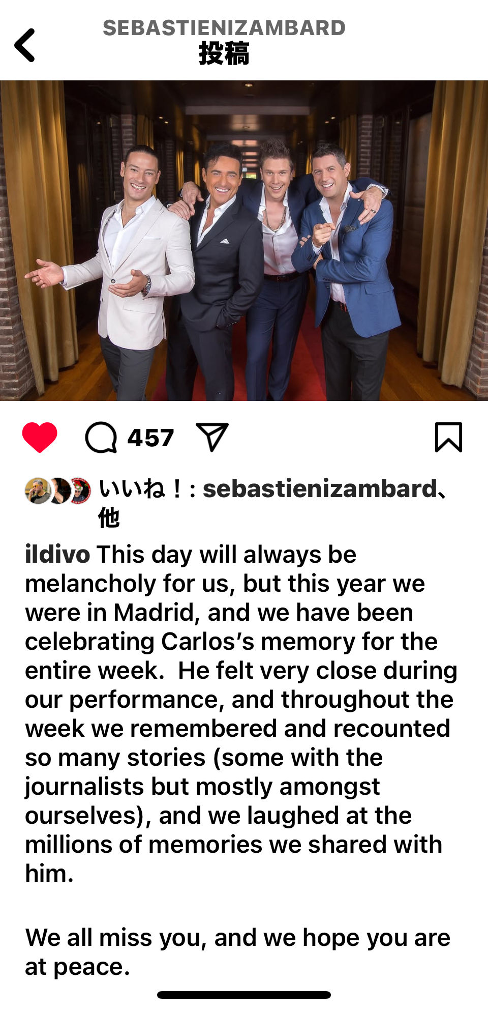 12月19日はイル・ディーヴォのカルロス・マリンの命日グループ解散になるかもしれないと思っていた頃もありましたが、スティーヴンさんの加入で見事に復活。今年は彼らはちょうどお仕事で、カルロスの故郷,スペインのマドリッドに滞在中。彼の事を想い過ごしているんでしょうね。インスタより↓