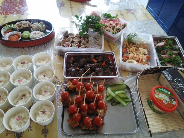 ガラス作家の方の個展 オープニングパーティ立食のオードブルを作りました。揚げ鮭のマリネ チーズカナッペ レーバー炒り煮 鴨ローストのサラダ 野菜の肉巻 トルティーヤのサーモンサンド さくらごはんこれは トルティーヤのサーモンサンドサーモンとクリームチーズの相性は抜群可愛いワックスペーパーで包んでみました